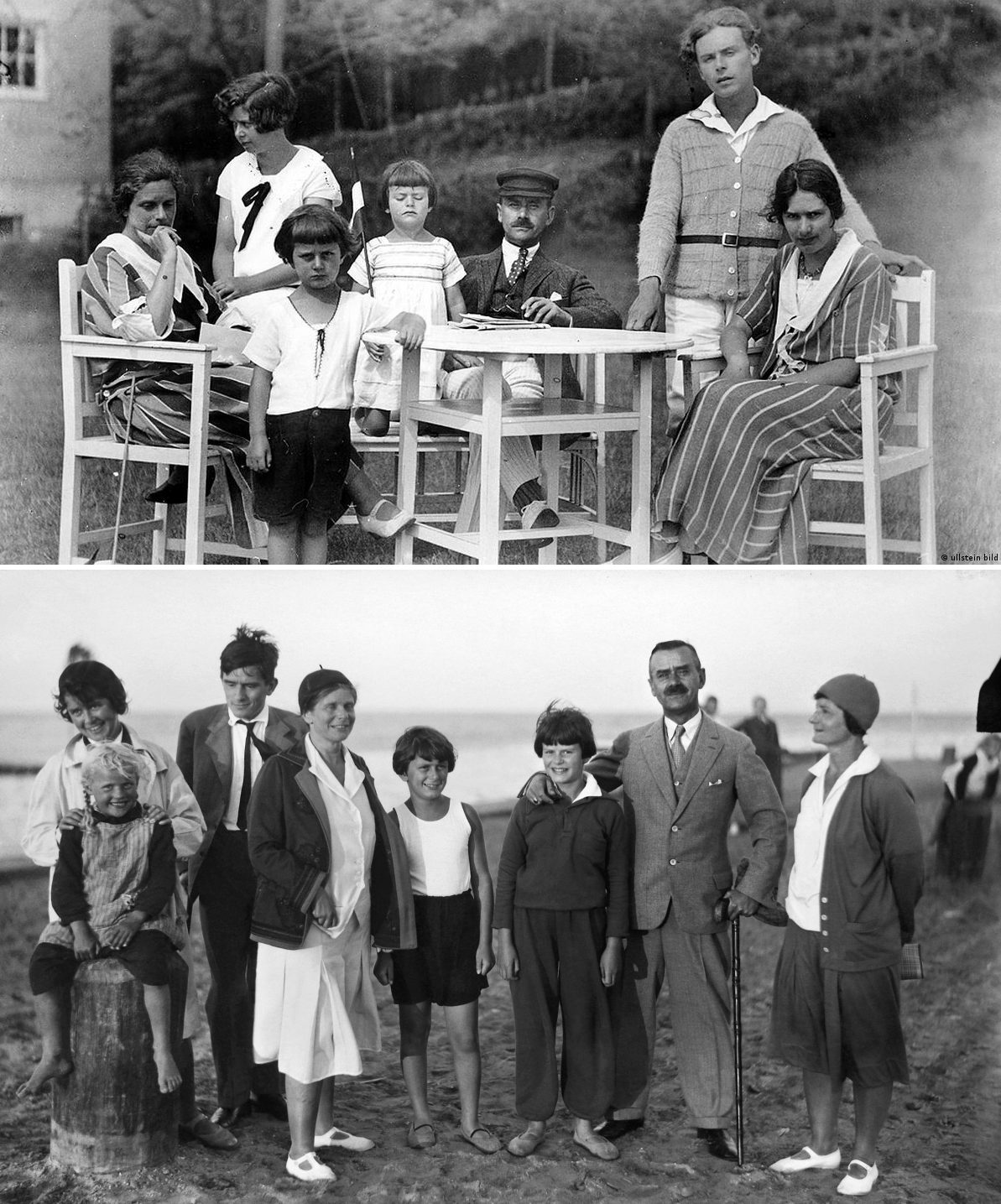 Cuesta encontrar una foto familiar que no revele la predilección de Thomas por su quinta hija —a su derecha en las dos fotos—. Repaso aquí, siguiendo la imagen superior y empezando por la izquierda, el destino intelectual de los seis hijos: junto a Katia Mann, están Monika (escritora), Michael (músico y profesor) y Elisabeth (escritora y laureada experta en la defensa de los océanos); y a la izquierda de Thomas, posan Klaus (escritor) y Erika (escritora y actriz). Golo (historiador y filósofo) no aparece —¿tal vez sacó la foto?—, pero se le puede ver abajo —el tercero por la izquierda, con corbata—. Aun así, según el biógrafo Tilmann Lahme, Elisabeth fue la única que logró eludir la huella intelectual y personal del padre. Aquí puedes conocerla mejor.