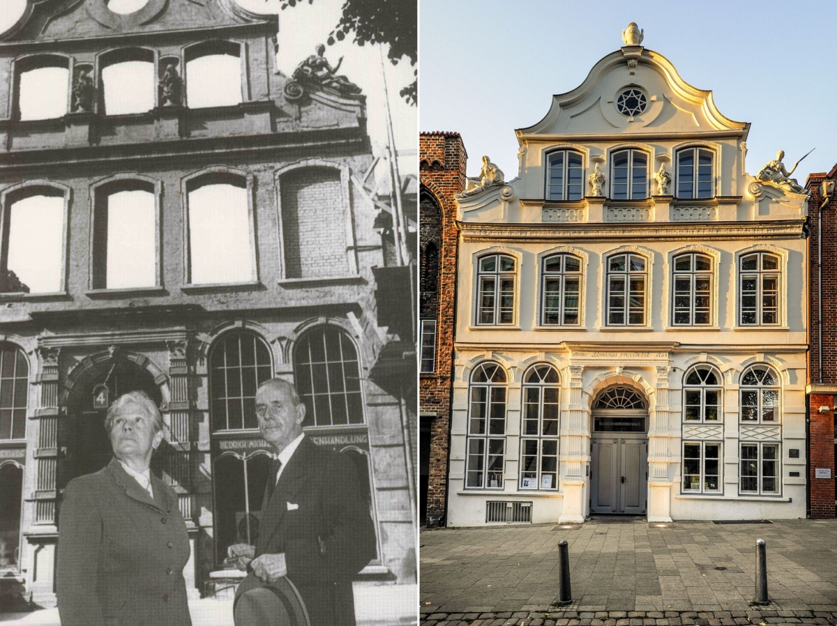 La vivienda familiar en Lübeck, donde crecieron Thomas y sus hermanos —entre ellos Heinrich, célebre autor de El súbdito y El profesor Unrat—. Tras su exilio americano, Mann volvería a Europa en 1952. Nunca más viviría en Alemania, pero sí la visitaba con frecuencia desde Suiza. A la izquierda, con Katia ante las ruinas del hogar de su infancia; a la derecha, la casa restaurada y convertida en museo. Clic aquí para saber más sobre el lugar.