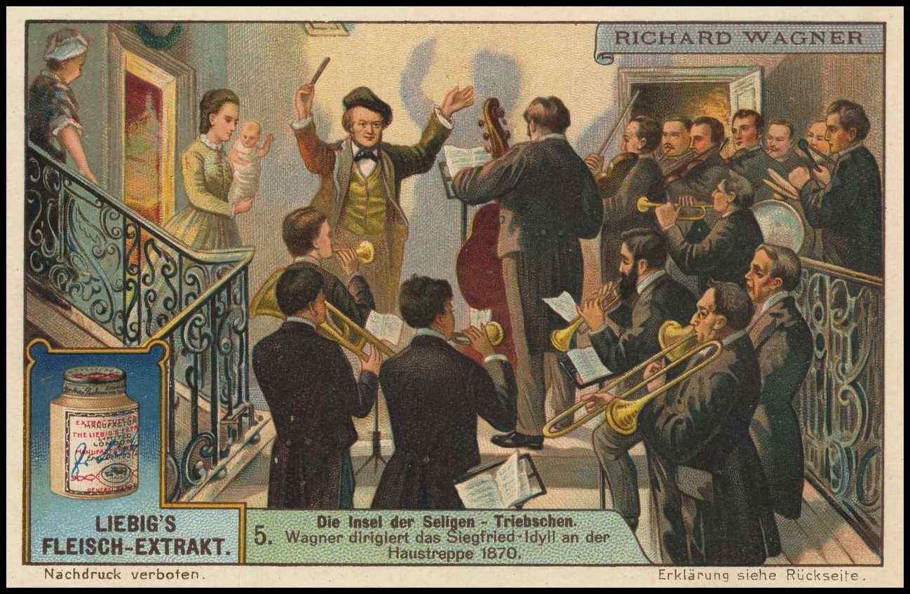 Siegfried nació el 6 de junio de 1869. En la Navidad del 70, Wagner despertó a su mujer, legítima al fin, con una pequeña orquesta que había ensayado en secreto una obra para ella: el Idilio de Siegfried. La estampa, de 1913, está entre los miles de tarjetas publicitarias —hoy muy buscadas— del fabricante de extracto de carne Liebig. Explóralas aquí; y aquí está el Idilio en su versión original para 13 músicos.