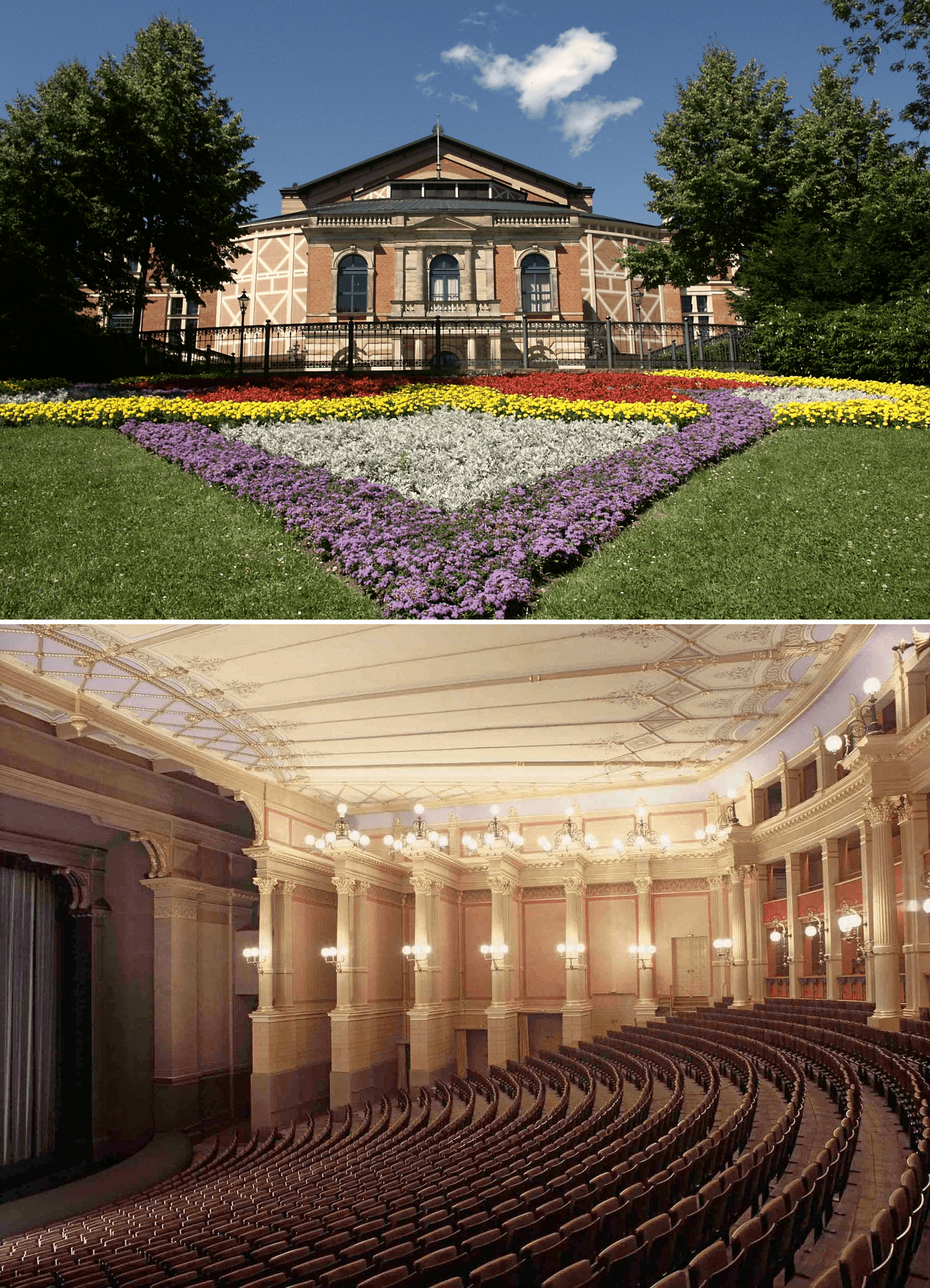 Iniciado en mayo del 72 e inaugurado cuatro años después, el Festspielhaus —o Teatro del Festival— de Bayreuth fue diseñado por el propio Wagner para acoger la enormidad de su puesta en escena. Sin galerías ni palcos, tiene forma de abanico y la visibilidad es perfecta desde sus 1.925 localidades. Su foso —bajo techo y del todo oculto al público— puede albergar a 124 músicos. Sorprendía también al principio la oscuridad total de la sala durante el espectáculo. La modernidad del interior contrasta, además, con el barroquismo de la vecina Ópera del Margrave. El Festival de Bayreuth reúne cada año a una orquesta y coro propios que solo interpretan las óperas de Wagner. La excepción es la Novena de Beethoven, pieza con que se inauguró el evento en 1876 y que, por ello, se incluye a menudo en el programa. Aquí puedes leer la historia del festival; aquí se ofrece una visita virtual por todo el recinto.