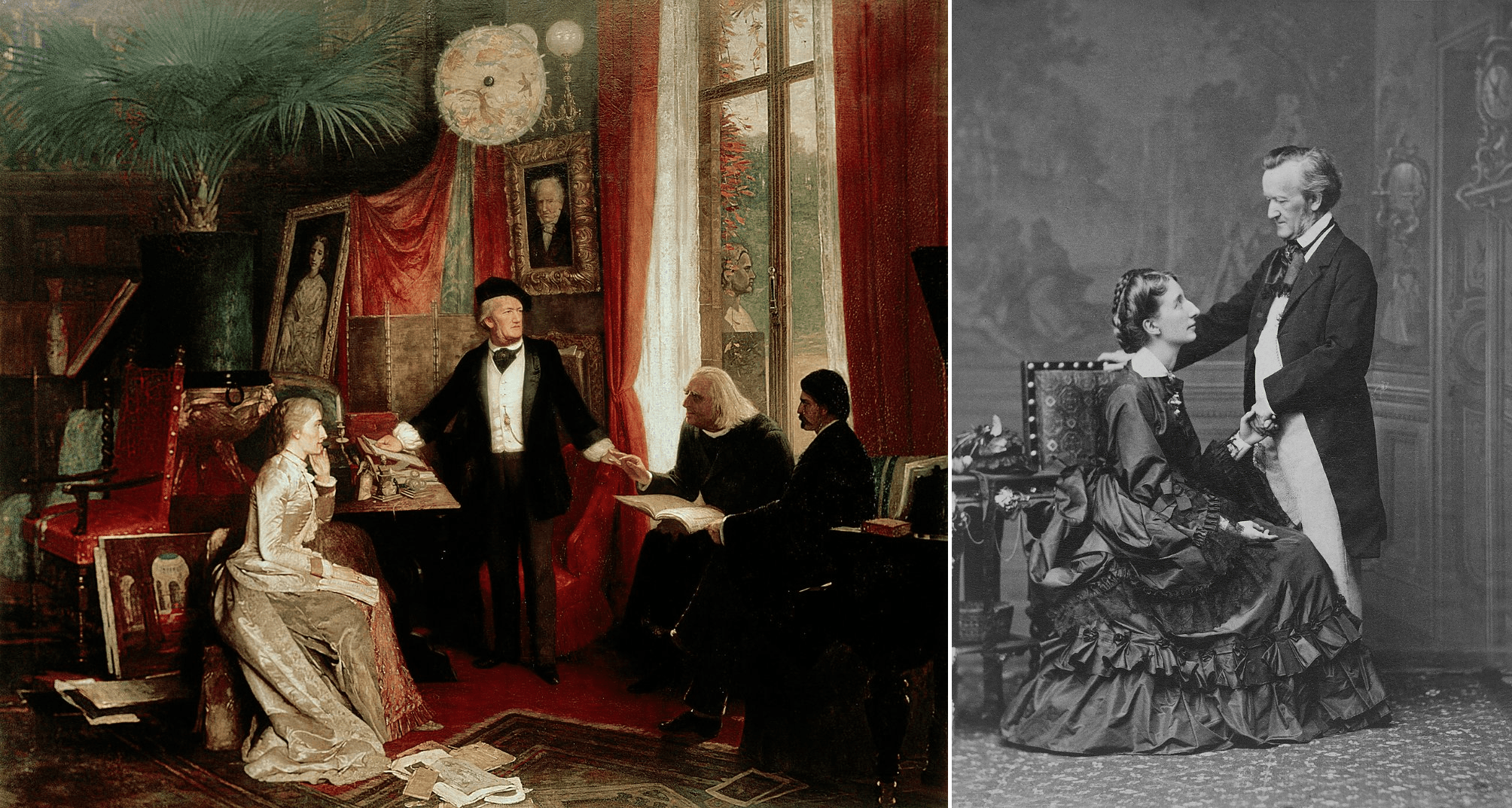 En la primera imagen —de izquierda a derecha—, Cósima, Wagner, Liszt y Hans von Wolzogen en un cuadro de Wilhelm Beckmann (1882); como fondo, una sala de la casa familiar en Bayreuth. Al lado, los Wagner en una foto tomada en Viena en 1872, poco después de poner fin al «idilio de Tribschen».
