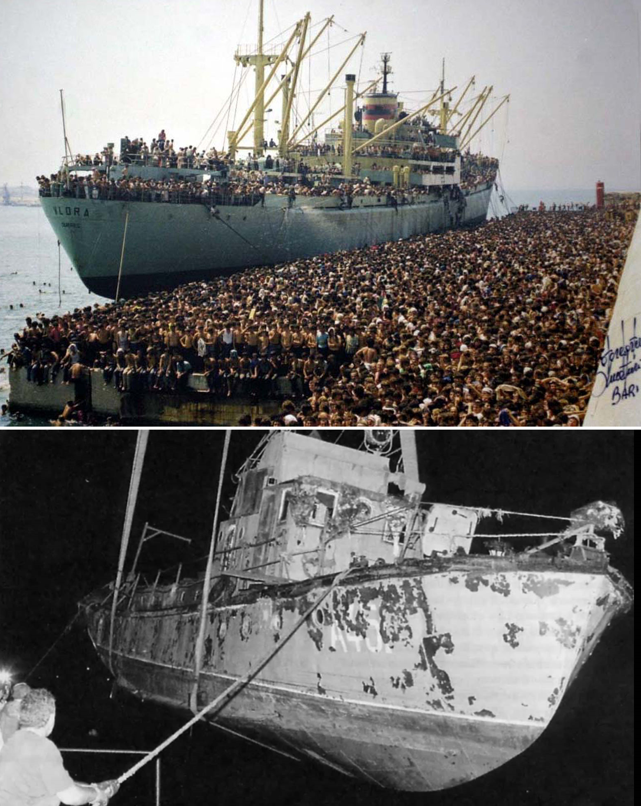 Arriba, los 20.000 albaneses que —el 8 de agosto de 1991— abarrotaron por la fuerza el Vlora, un buque que esperaba reparaciones en el puerto de Durrës. Cruzaron con dificultad el Canal de Otranto y llegaron a Bari, donde se les impidió arribar. Tras 36 horas sin agua ni comida, fueron trasladados a un estadio y lucharon por hacerse con los víveres lanzados desde el aire. El caos y la agresión fueron dueños hasta la deportación de todos ellos en los próximos días. El 28 de marzo de 1997, unos 140 albaneses huyeron en el Katër i Radës del estallido de violencia que asolaba el país. A su llegada a la isla de Sazan, la embarcación fue abordada por la corveta militar Sibilla, causando su hundimiento y la muerte de al menos 84 pasajeros. Abajo puedes ver el rescate de los restos. Infórmate aquí y aquí.