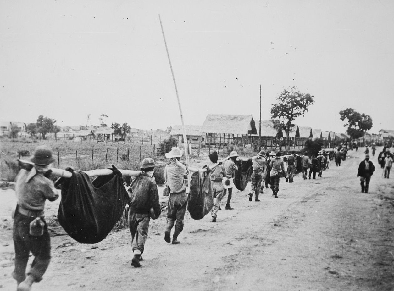De las atrocidades japonesas, hoy hablaré sobre dos —aquí y en la próxima imagen— ocurridas en el frente filipino. Soldados americanos cargan con los caídos en la Marcha de Bataán: en abril de 1942, cerca de 80.000 prisioneros fueron obligados a caminar hasta el campo de Cabanatúan, a unos 100 kilómetros de Bataán. Muchos —la cifra varía entre 6.000 y 20.000— murieron por malos tratos, hambre o enfermedad. Pincha aquí o en la foto.