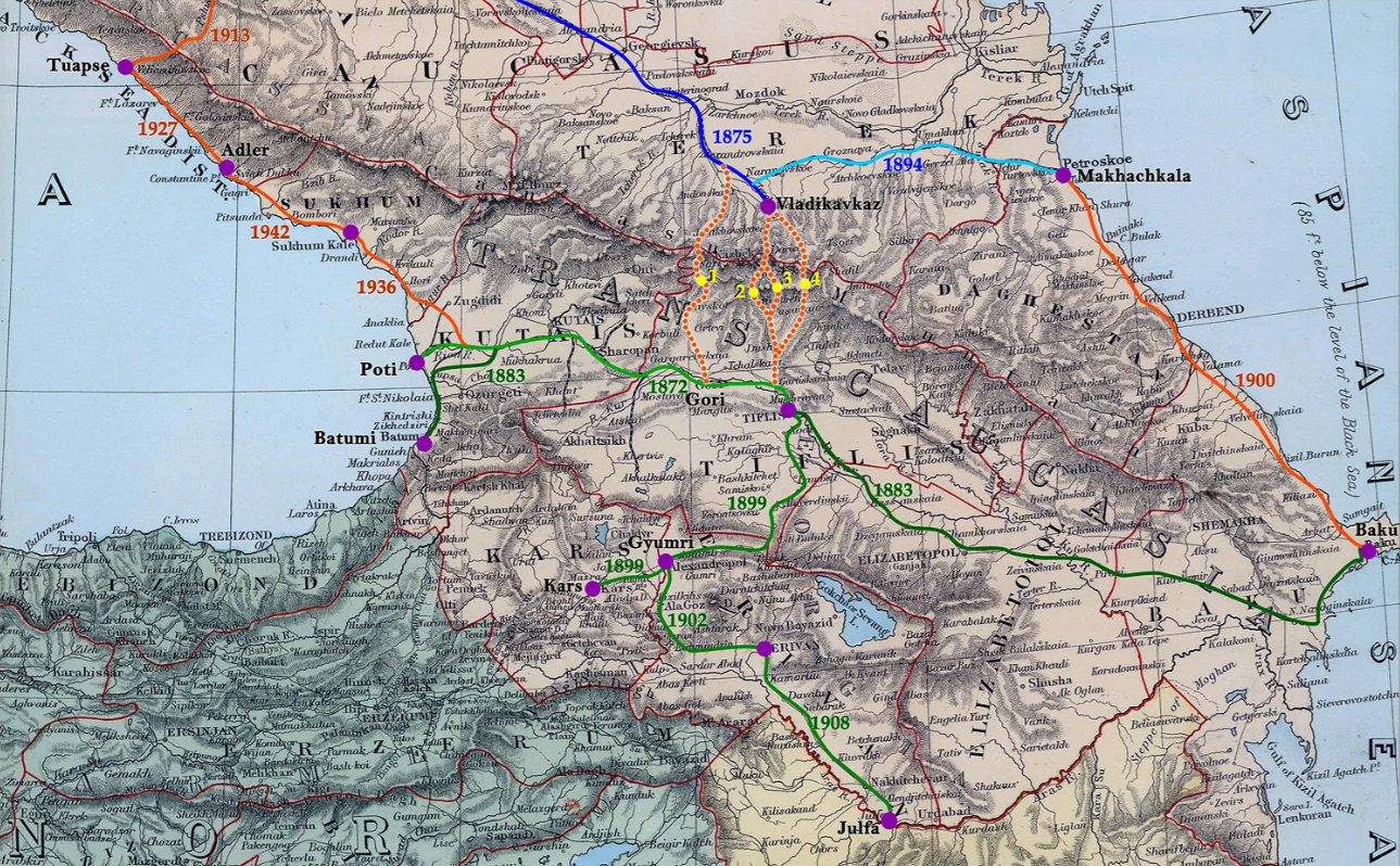 La construcción del Transcaucasiano se inició en 1865 en la ciudad georgiana de Poti —en la costa del Mar Negro—, y logró el objetivo de llegar a Bakú —en la costa azerbaiyana del Mar Caspio— en 1883. Poco después, se iniciarían los trabajos de expansión y unión con otras líneas rusas. En el mapa puedes ver el desarrollo de las vías; y aquí puedes leer más sobre la mítica línea ferroviaria.