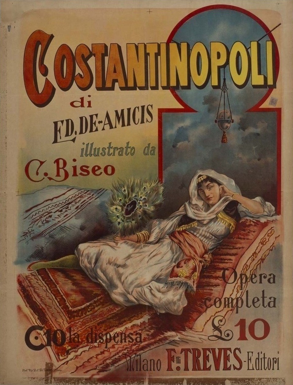 El relato de Amicis, publicado en dos tomos entre el 77 y el 78, fue muy pronto traducido a muchas lenguas europeas, incluyendo la versión española del 83. Los mismos editores —los hermanos Treves, de Milán— lanzaron en 1882 esta lujosa impresión en un volumen de mayor tamaño, enriquecida con 200 grabados de Cesare Biseo. El artista, que en 1875 había estado en Marruecos con Amicis, visitó por encargo Estambul con el texto, después de que Junck —fallecido en Pisa a finales del 78, con solo 29 años— dejara huérfano el proyecto. Aquí tienes algunas obras orientalistas de Biseo; aquí puedes leer un artículo sobre el viaje de Amicis y el papel que tuvo Junck; aquí, más información sobre Junck.