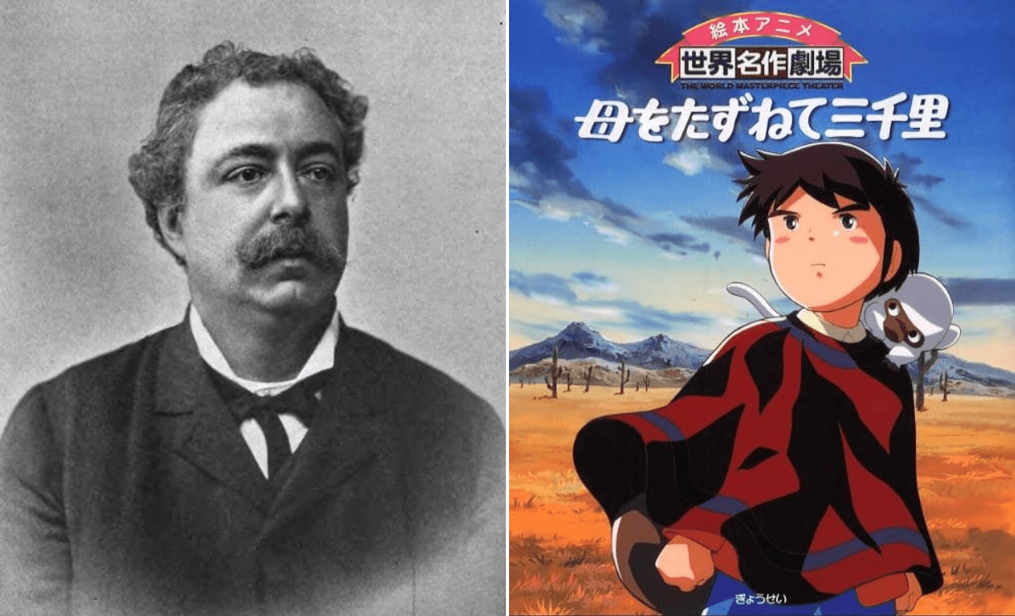 Apenas se recuerda a Edmondo de Amicis —a la izquierda—, y no muchos saben que en su novela Corazón —de 1886— se incluye el relato «De los Apeninos a los Andes». A la derecha, Marco en la portada del célebre anime japonés de los setenta. Como Tico en Willy Fog, el monito Amedio es una invención televisiva. Puedes leer más aquí y aquí.