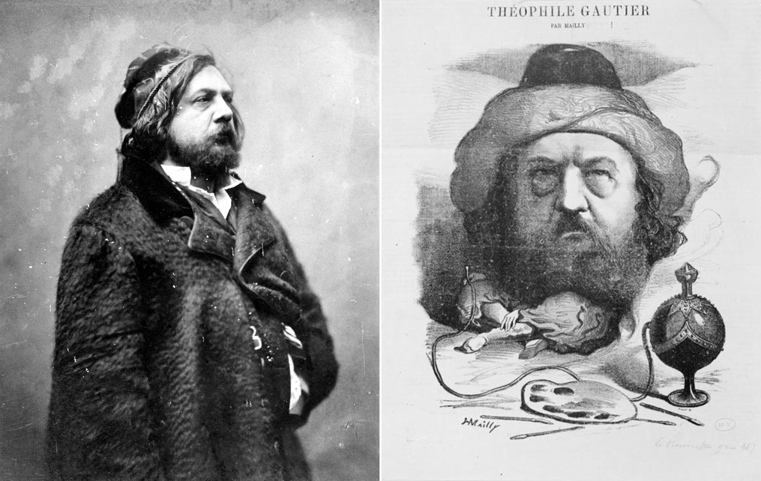 Dos imágenes de Gautier: a la izquierda, posando en 1857; a su lado, orientalizado en una caricatura de Hippolyte Mailly publicada por Le Hanneton en 1867. Aquí tienes más datos sobre su vida y obra; y aquí puedes visitar la Société Théophile Gautier, con infinidad de recursos y retratos del autor y sus contemporáneos. Pincha las fotos para ampliarlas.