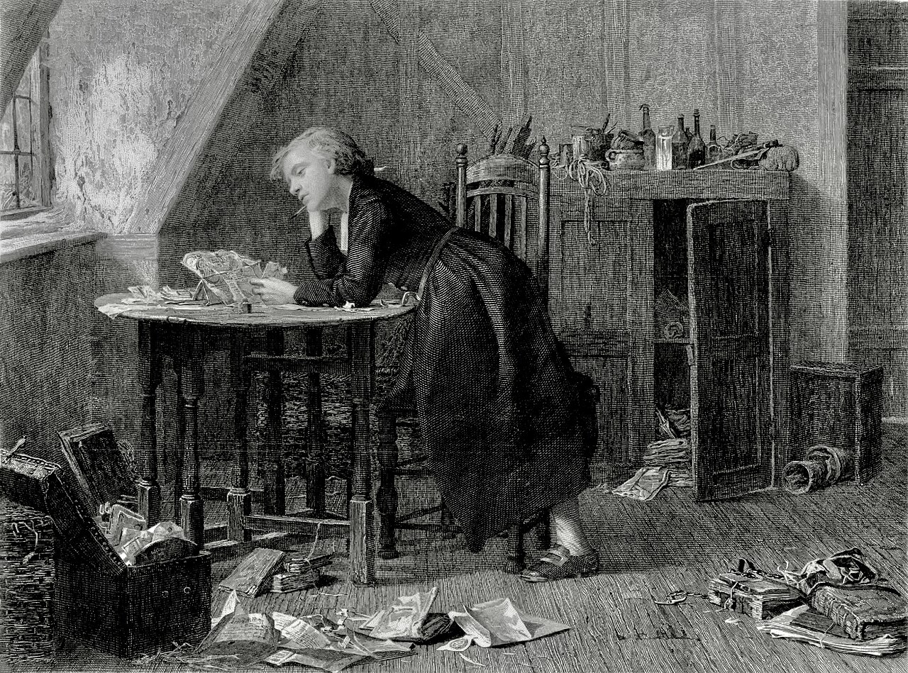 Thomas Chatterton en un grabado de 1872. Nació en Bristol en 1752 y estudió en las escuelas de la caridad. Fascinado por los objetos de la iglesia de St. Mary Redcliffe —de la que su tío era sacristán—, desarrolló una obsesión por la Edad Media. Con ocho años, leía códices durante todo el día; y a los once compuso la primera de las obras que atribuyó al supuesto monje medieval Thomas Rowley. Lee aquí tres poemas; y aquí, algo más sobre su figura.