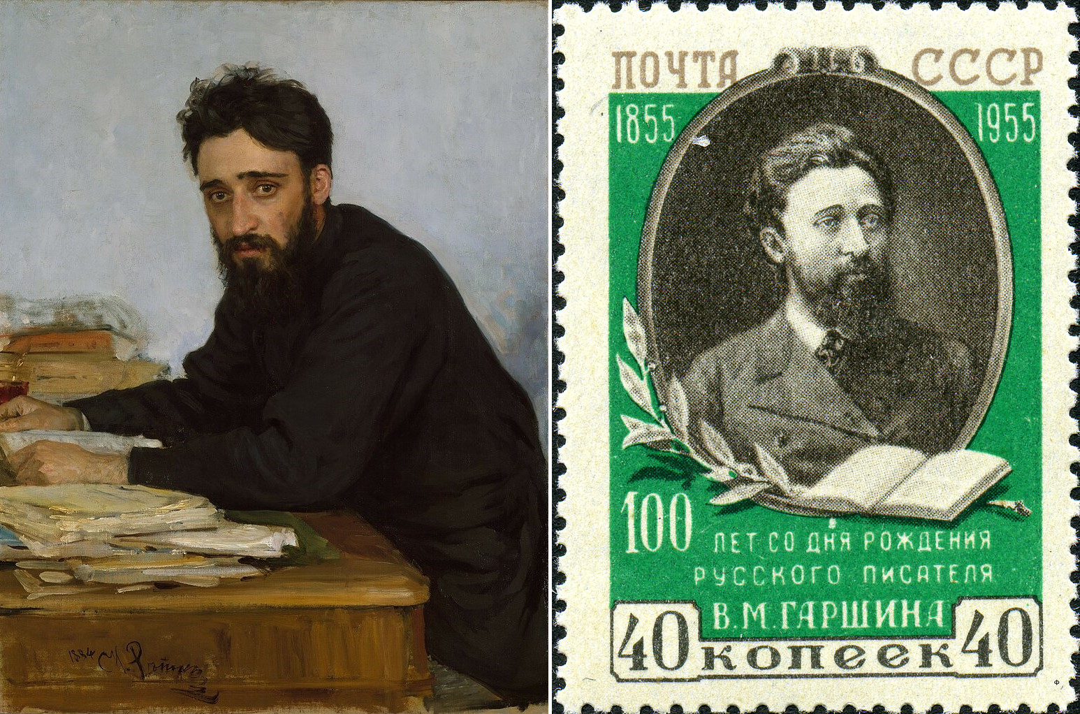 «La flor roja» es el cuento más célebre de Garshin, y encaja —junto a Gógol, Chéjov o Leskov— en la tradición rusa de las historias de manicomio. A la izquierda, Garshin en su escritorio, retratado por Iliá Repin en 1884. A la derecha, el sello dedicado al autor por el servicio postal ruso en el centenario de su nacimiento. Clic aquí o aquí para saber más.