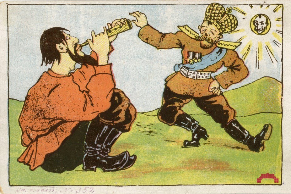 El zar bailando al ritmo de Rasputin (1910). El monje lucía una mirada inquietante y su discurso era elíptico y casi oracular; a esos encantos se unía un origen siberiano que le hacía genuinamente ruso. Eso no le salvó, con la llegada de la guerra, de ser acusado de espía encargado de despertar la sangre alemana que llevaba la zarina. Haz clic aquí para leer sobre su influjo en la familia real.