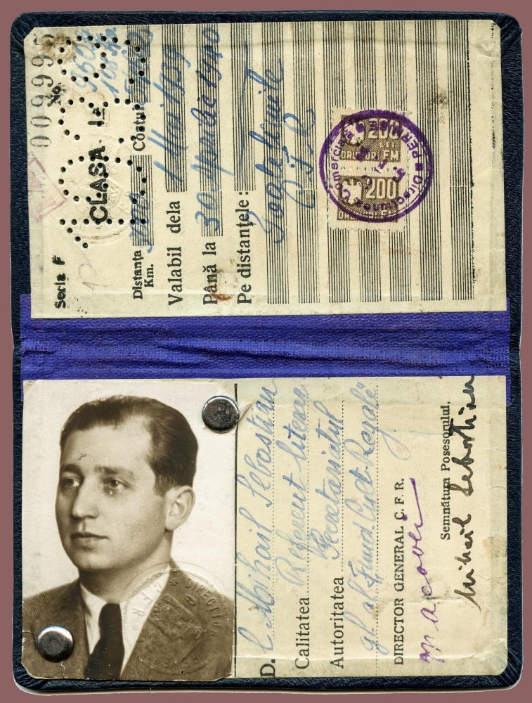 Mihail Sebastian en su abono para el ferrocarril rumano (de mayo de 1939 a abril de 1940). A pesar de mantener, desde marzo del 39, un acuerdo para suministrar petróleo al Tercer Reich, Rumanía no entraría formalmente en la guerra hasta su adhesión —en noviembre del 40— al Pacto Tripartito firmado en septiembre por Italia, Japón y Alemania. El gobierno fascista de Ion Antonescu pretendía resarcirse, después de que la URSS ocupara Besarabia en julio y los acuerdos internacionales forzasen a Rumanía a ceder importantes territorios a Hungría y Bulgaria. Impulsadas por la Guardia de Hierro de Horia Sima, las leyes antisemitas y xenófobas eran ya una realidad, y muy pronto los nazis en suelo rumano llegarían al medio millón. Haz clic en la imagen para ampliarla o aquí para saber más.