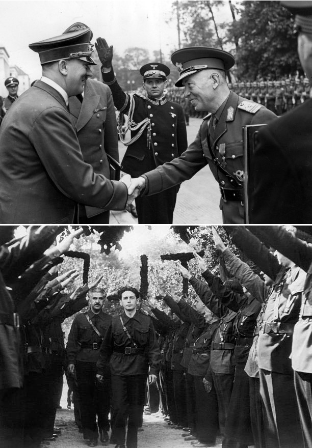 Arriba, Hitler recibe al mariscal Antonescu en Múnich (1941). Abajo, la Guardia de Hierro saluda a su líder, Horia Sima (1940). Ambos fueron los máximos responsables del Holocausto rumano, pero su relación no fue fácil. De hecho, tras compartir gobierno en 1940, la Guardia quiso tomar el poder a principios del 41. Abortado el golpe, Sima y los suyos huyeron al Reich, donde les dieron asilo. Tras la entrada en Bucarest del Ejército Rojo, Antonescu fue arrestado y llevado a Moscú; dos años después, sería devuelto a Rumanía para su juicio y ejecución (1946). Tras su caída, Sima fue nombrado por los nazis jefe de un inútil gobierno rumano en el exilio. Al final de la guerra, logró llegar con documentación falsa hasta España, donde colaboraría con Franco. Consiguió vivir impunemente en Madrid hasta 1993. Pincha en la foto o aquí para saber más sobre el tema.