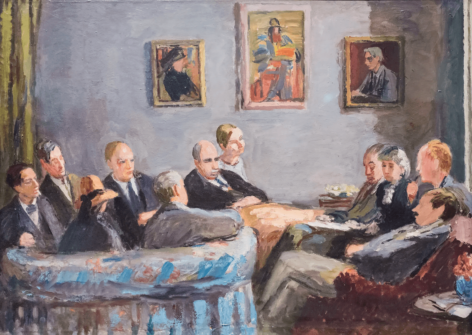 Tras la Gran Guerra, Bloomsbury renació como el Memoir Club. Vanessa pintaría al grupo en 1943. Leonard es el segundo por la izquierda, el sexto es Maynard Keynes, Clive Bell fuma en pipa, y Forster —con bigote— se reclina en su sillón. Vanessa, con sombrero, da la espalda; y en la pared cuelgan los retratos de miembros ya difuntos: Virginia, Lytton Strachey y Roger Fry. Aquí puedes identificarlos a todos; aquí y aquí, leer y ver fotos sobre el grupo.