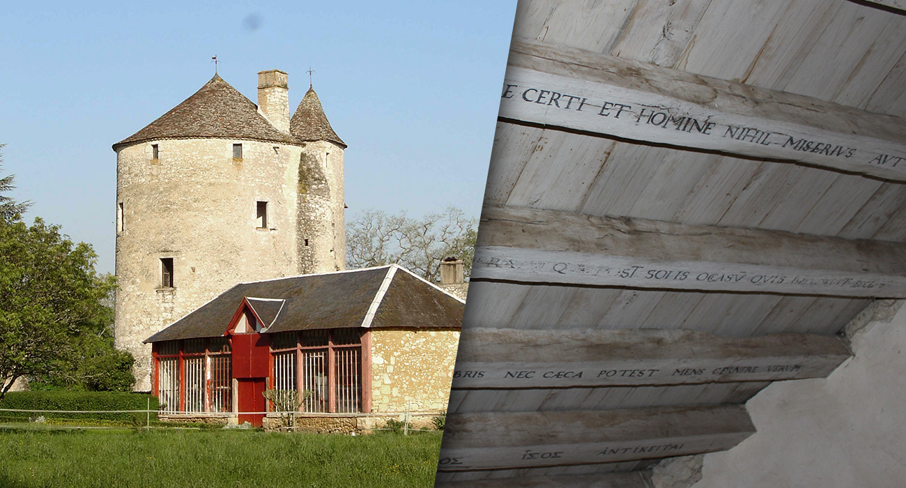 A la izquierda, la torre de Montaigne, única parte del castillo original que sigue en pie. A la derecha, el techo de la biblioteca, en cuyas vigas el autor hizo inscribir máximas griegas y romanas. Solía mirar arriba en busca de inspiración. Pincha en la foto o aquí para leer sobre Montaigne y La Boétie.