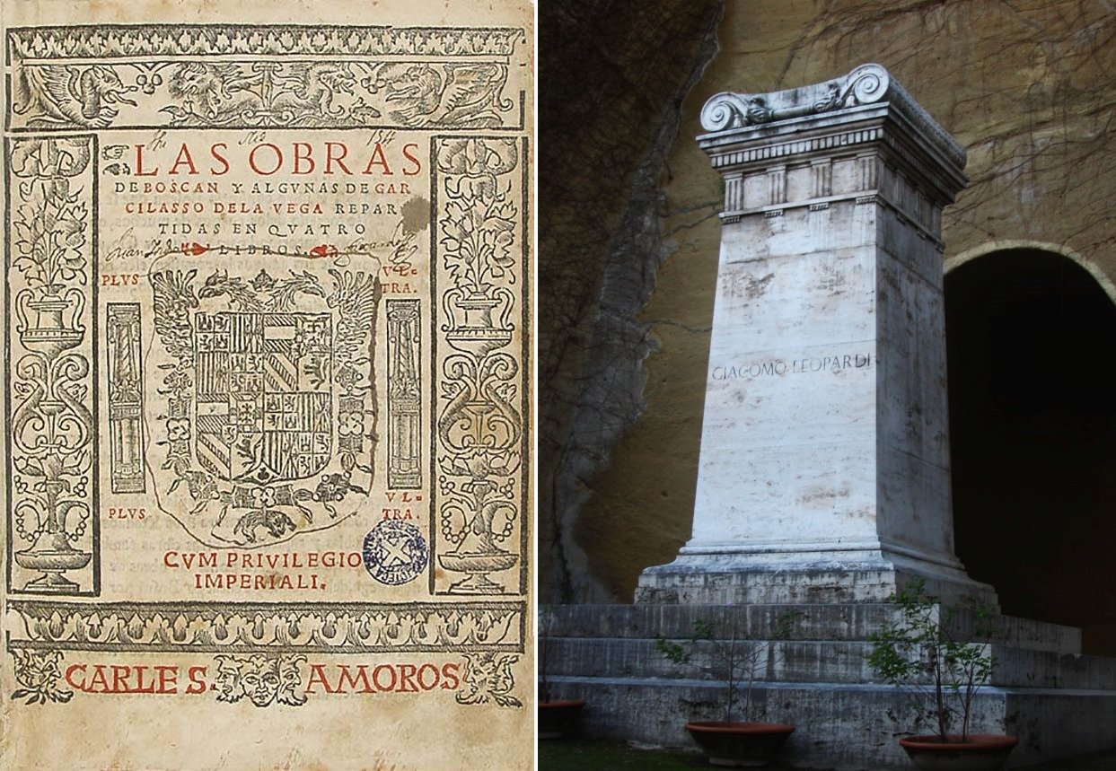 A la izquierda, la primera edición de las obras de Juan Boscán (1543), que incluía en la parte final los poemas rescatados de su querido Garcilaso. A la derecha, el monumento a Leopardi en el Parco Virgiliano, jardín napolitano que se identifica como el lugar de reposo de Virgilio. Una lápida luce las líneas dedicadas por Ranieri «all’amico adorato». Lee aquí sobre la vida y la sexualidad de Leopardi.