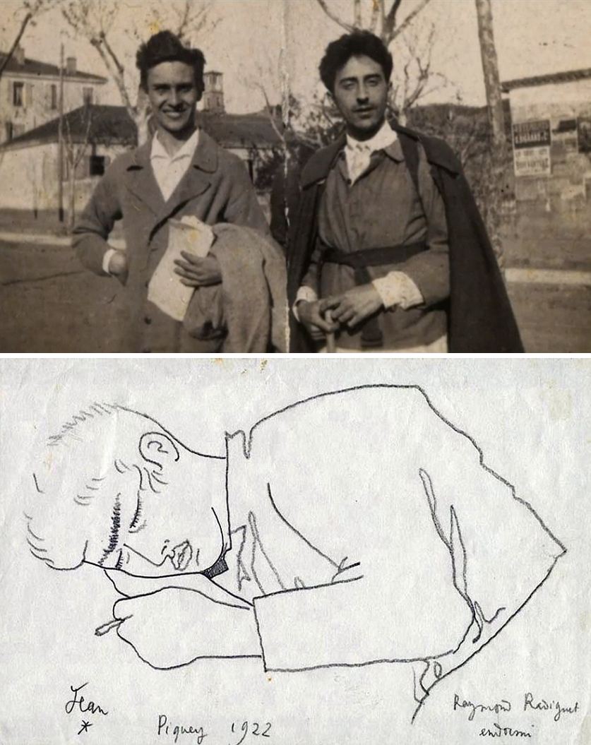 Arriba, Raymond Radiguet y Jean Cocteau. Abajo, dibujo del joven dormido, firmado por Cocteau en 1922. El diablo en el cuerpo —el romance entre un jovencito y una mujer casada, mientras su marido lucha en las trincheras de la Gran Guerra— causó un notable escándalo, y grupos de veteranos se quejaron cuando el libro ganó el Prix du Nouveau Monde —en el jurado, por cierto, estaba Cocteau—. Su relación fue tormentosa, pero juntos fundaron la revista Le Coq y se codearon con la flor y nata de la vanguardia francesa —desde Coco Chanel hasta Picasso, pasando por Juan Gris, Modigliani, Poulenc y Milhaud—. Opio, alcohol y lujo —junto a amantes de ambos sexos— marcaron la brevísima vida de este nouveau Rimbaud —como algunos lo llamaban—. Pincha aquí o aquí para leer sobre él.
