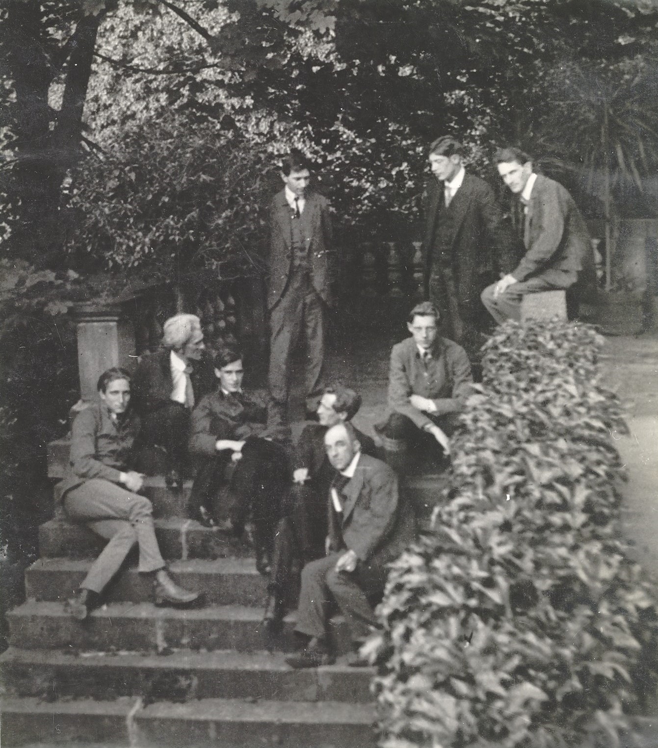 Stefan George y algunos discípulos en Heidelberg (1919). El George-Kreis —o «Círculo de George»—, formado en torno a la revista Blätter für die Kunst (1892-1919), funcionaba de modo un tanto sectario, casi como una fraternidad de caballeros medievales. En él introdujo George al jovencísimo Maximilian Kronberger, a quien —convertido en el dios Maximin— rendirían culto los miembros del Círculo. En la foto, de izquierda a derecha: Percy Gothein, el propio George —con pelo cano—, Erich Boehringer, Ernst Gundolf, Ernst Glöckner, Berthold Vallentin, Woldemar von Uxkull-Gyllenband, Ludwig Thormaehlen y Friedrich Gundolf. Pincha aquí para saber más. Puedes ampliar la imagen.