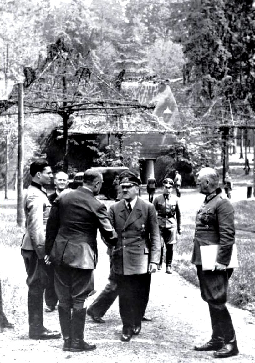 El de la izquierda es Claus von Stauffenberg, coronel del ejército alemán y cerebro de la Operación Valquiria. El plan pretendía acabar con la vida de Hitler y arrestar a Goebbels, Göring y Himmler. La imagen se tomó en Rastenburg el 15 de julio de 1944; Stauffenberg llevaba consigo la bomba de un kilogramo, pero no la detonó hasta el día 22, aprovechando una reunión del alto mando. La explosión mató a cuatro personas, pero Hitler —protegido por la solidez de la mesa— solo resultó herido. Stauffenberg y otros implicados fueron fusilados sin juicio por un golpista que temía ser acusado. Junto a sus hermanos mayores —los gemelos Berthold y Alexander—, Claus fue miembro del George-Kreis. No se sabe a ciencia cierta si, antes de morir, Stauffenberg gritó «¡Viva la Alemania sagrada!» o «¡Viva la Alemania secreta!». Clic en la foto o aquí para saber más.