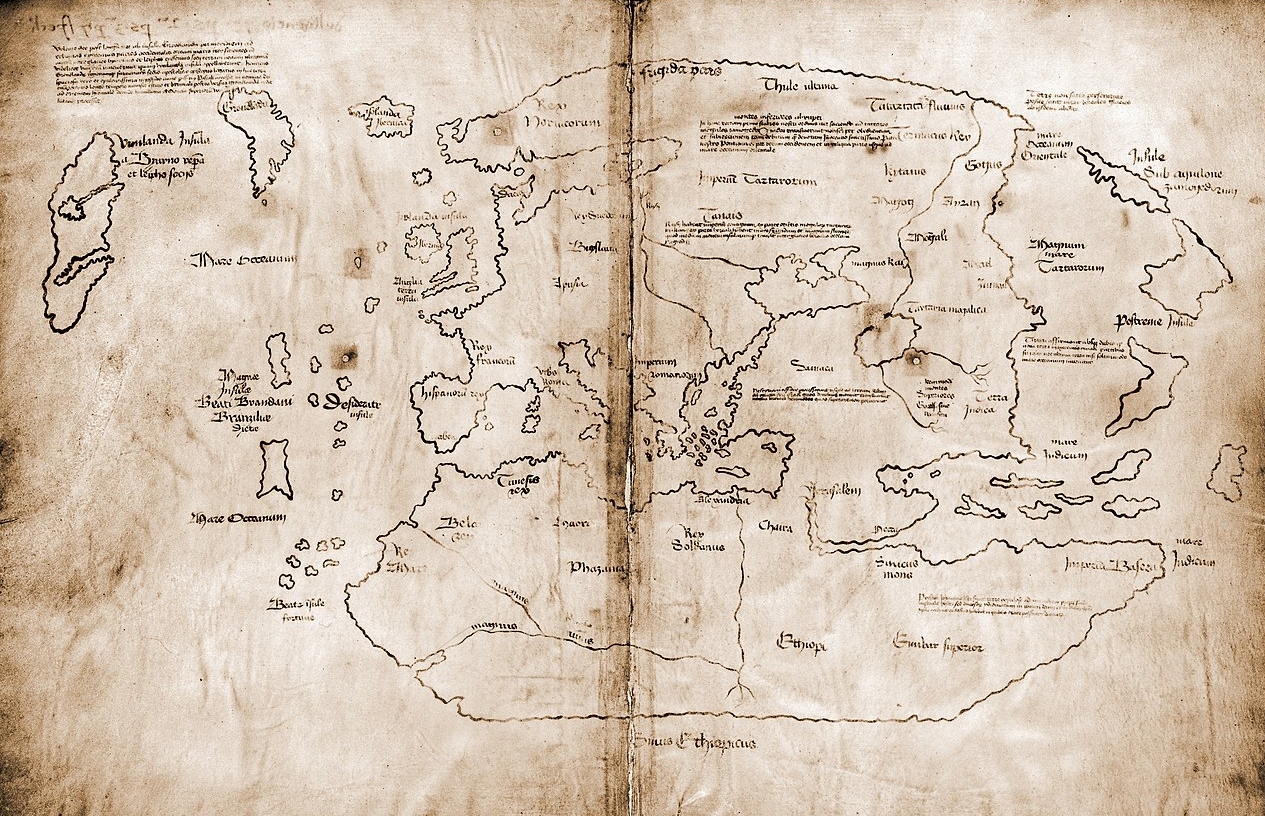 Mapa de Vinlandia descubierto en 1957, adosado a un auténtico códice medieval. Su interés radica en la presencia de Terranova, arriba a la izquierda. La naturaleza de la tinta y la corrección en el perfil de Groenlandia generaron unas sospechas que los análisis posteriores agudizaron más aún. Pincha en la imagen para ampliarla o aquí para leer sobre el mapa, hoy en manos de la Universidad de Yale.