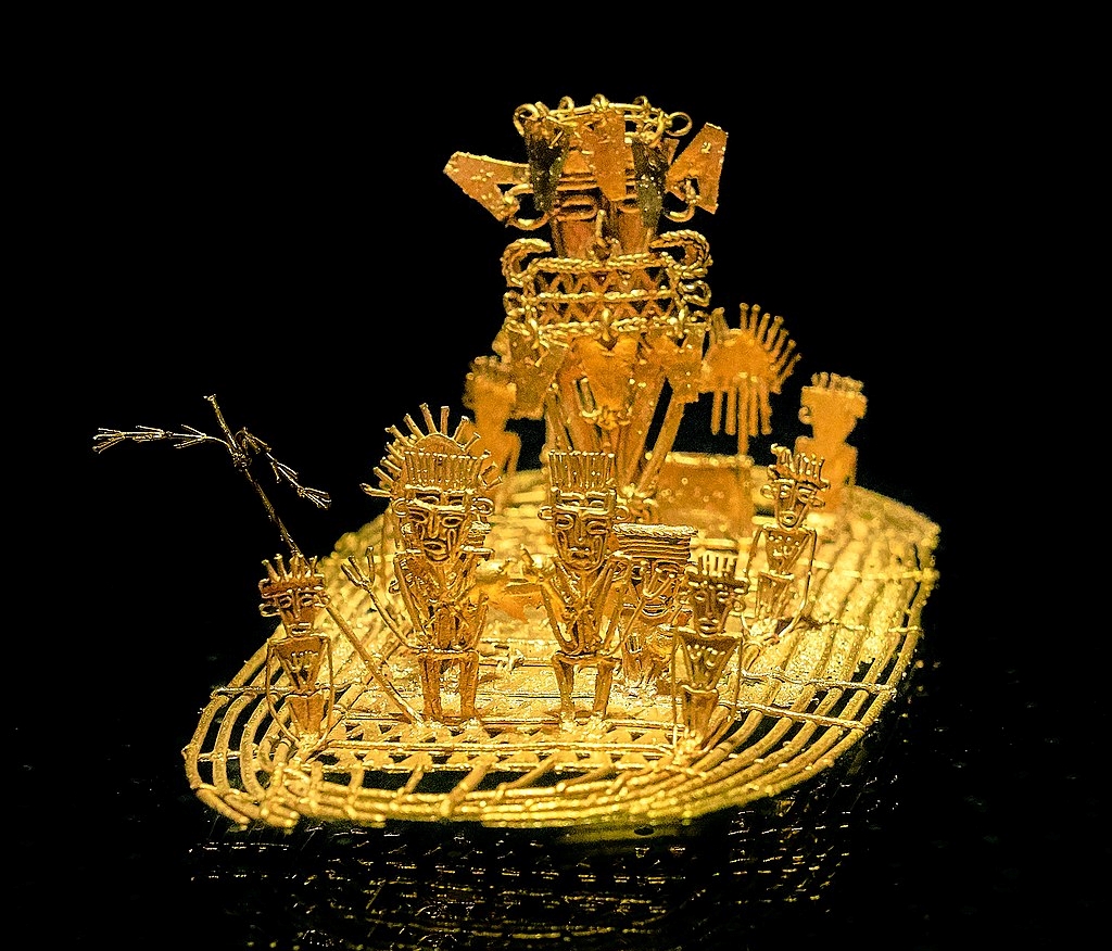 Representación del ritual del «indio dorado» en una balsa de la cultura muisca (Colombia). El heredero del cacicazgo era totalmente cubierto de polvo de oro y portado en una balsa al centro de la laguna Guatavita. Allí arrojaba riquezas de todo tipo como ofrenda para una cacica que, en tiempos remotos, se había arrojado al agua en defensa de su honor. Es el probable origen de la leyenda de El Dorado. Pincha en la foto o aquí para leer sobre este tema.