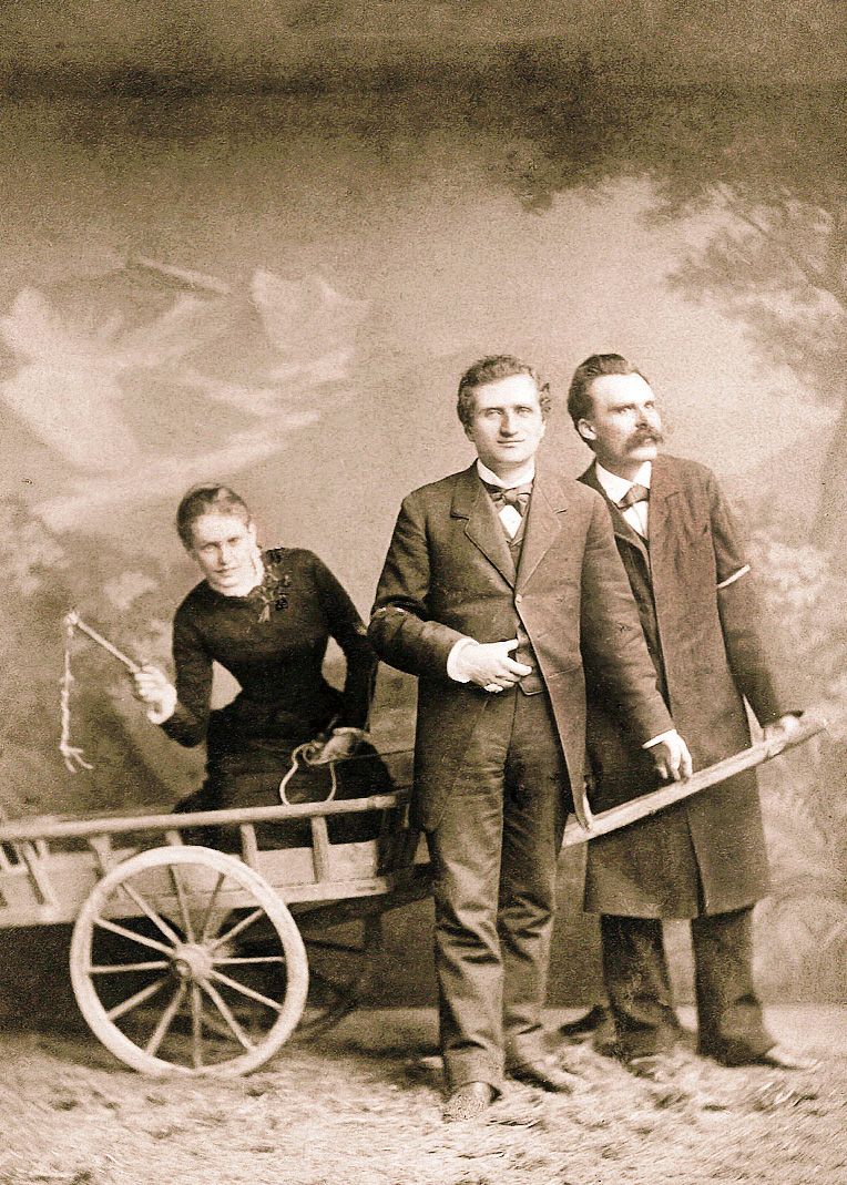 Una de las fotos más famosas —y absurdas— de la historia de la filosofía: Lou von Salomé, Paul Rée y Friedrich Nietzsche posan en actitud campestre. La imagen se tomó en 1882, e ilustra al detalle una ocurrencia del «filósofo del martillo»: los amigos, en idílica armonía, mueven juntos el carro del saber. Pero el humor no duró mucho: habiendo rechazado Lou sendas peticiones de mano, Nietzsche prefirió reinterpretar que ella conducía —fusta en mano— un carro del que él y Rée tiraban como bueyes. Así habló Zaratustra se escribió poco después de que el «trío» saltara en pedazos, y es difícil no pensar en Lou —e incluso en esta imagen— al leer pasajes tan feroces como el célebre aforismo: «Si vas con mujeres, no olvides el látigo». Lee aquí una entrada sobre esta rara relación. También se basa en ella la película italiana Más allá del bien y del mal (1977).