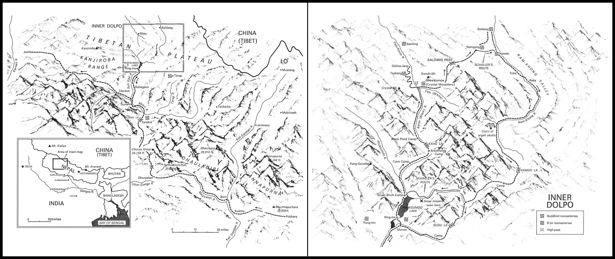 Estos mapas se incluyen en el libro de Matthiessen desde su primera edición. El de la derecha amplía la zona de Dolpo, encuadrada en la parte superior del otro mapa. Pínchalos para ver —marcados con puntos— los caminos de los viajeros y sus sherpas.