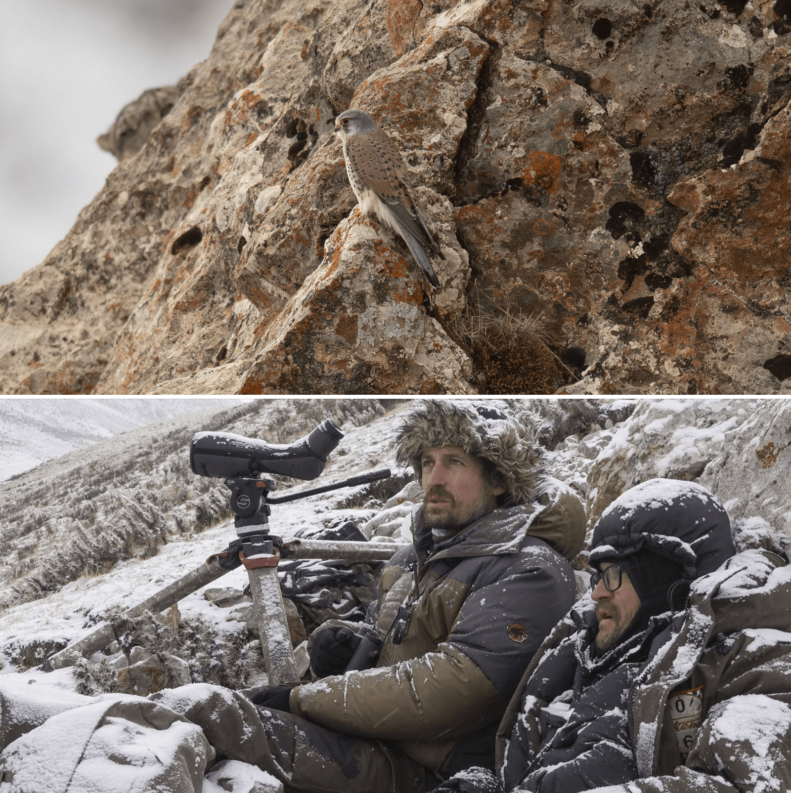 Arriba, tal vez la foto más famosa de Munier. En un viaje anterior al Himalaya, vio esta bonita pose de un halcón y la captó. Solo al revisar con calma sus tomas, descubrió al leopardo vigilando detrás de la ladera. Curiosamente, en su expedición con Tesson mostró la imagen a unos niños tibetanos que, casi aislados, vivían con su familia en la montaña. Ellos señalaron al felino de inmediato, como si tuviera el papel protagonista: «No porque su vida montañesa les hubiera aguzado la vista, sino porque su ojo de niño no se dejaba arrastrar a la certidumbre de lo consabido». Abajo, Munier y Tesson en su rececho.