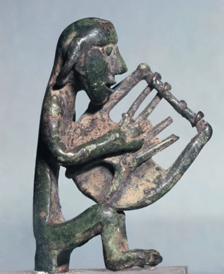 Esta figura de bronce mide 5,5 centímetros y está en el Museo Arqueológico de Heraclión, en Creta. Data del siglo IX a.C., y representa a un hombre cantando al son de un fórminx de cuatro cuerdas. Dos expertos de Viena les han asignado las notas mi, si, sol y fa, aplicando lo que los griegos luego llamarían «escala jónica». Así, sin alterar el sonido de las cuerdas ni ajustar su longitud con la otra mano, han grabado una hipotética reconstrucción de lo que pudo cantar Demódoco al empezar su actuación en la Odisea. Aquí puedes leer sobre el proyecto y escuchar la grabación. Aquí y aquí hay vídeos históricos del poeta analfabeto Sayakbay Karaláev improvisando en kirguís el poema oral de Manás, veinte veces más largo que los de Homero.