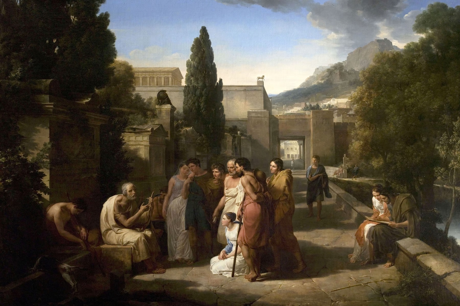 Homero canta la Ilíada a las puertas de Atenas, en un cuadro de Guillaume Lethière (1811). Las obras de arte inspiradas por Homero y sus historias son incontables. Aquí y aquí tienes dos buenas galerías de la Ilíada y la Odisea; y aquí se ofrece un artículo de James I. Porter sobre la idea de Homero que se desprende de los escritos y otras representaciones.