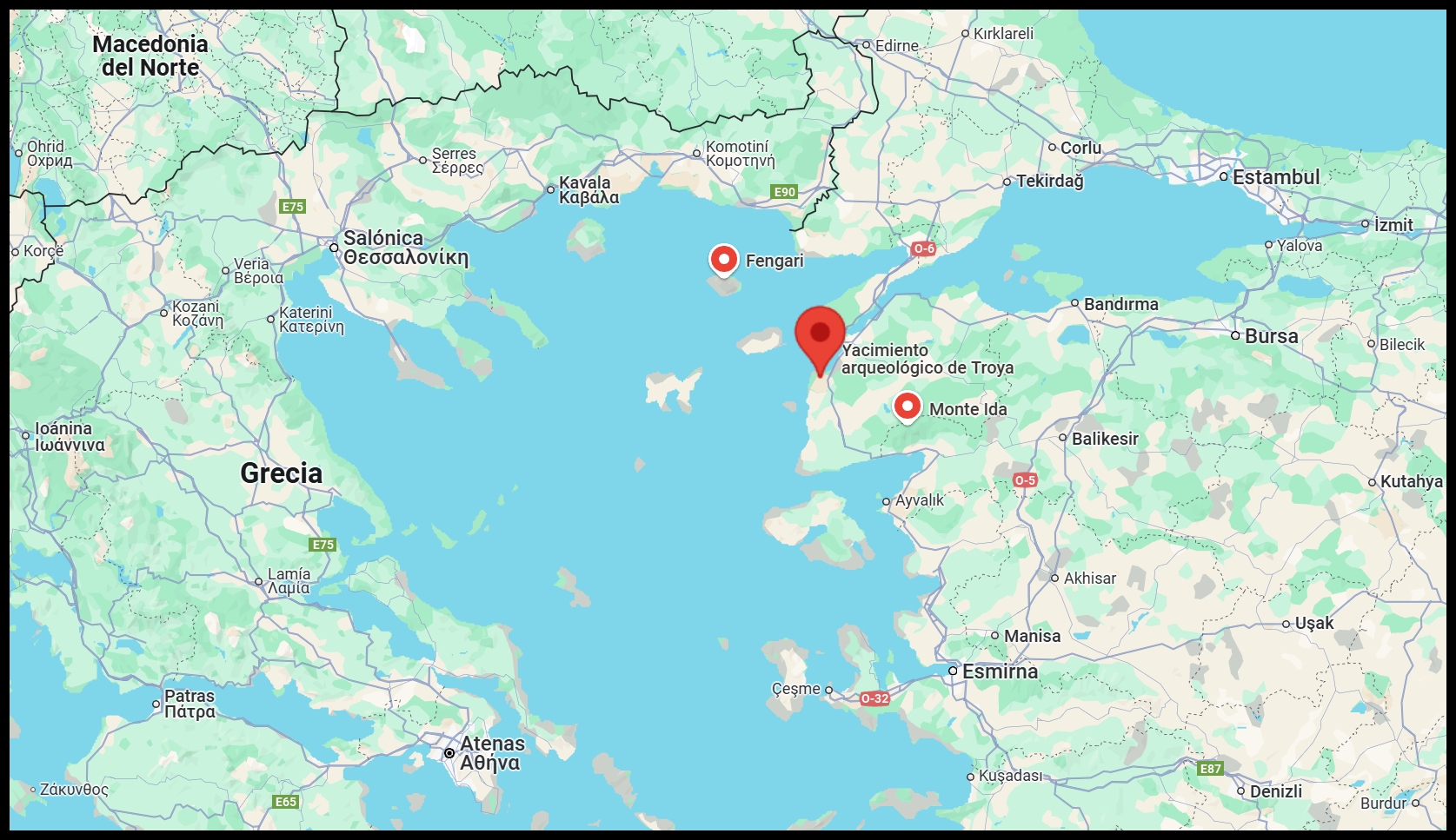 Pero Fox rescata entonces el testimonio de Alexander Kinglake, joven historiador inglés que visitó la zona en la década de 1830 junto a su amigo Methley —un domador de caballos de Yorkshire—. Decidieron llegarse al punto exacto en que se sienta Poseidón —«la más alta cima», recuerden—, y desde allí, sobre el monte Fengari, a 1.611 metros de altitud y salvando la isla vecina, tuvieron una vista franca de la costa troyana y el Ida. Hoy sabemos que desde Troya el efecto es más claro aún, con el Ida a un lado y el Fengari al otro, fundiéndose en el horizonte con el perfil de Imbros: «Nadie cuya mente no haya quedado reducida a la más deplorable condición lógica —escribió Kinglake— podría observar esta hermosa congruencia entre la Ilíada y el mundo material y, aun así, admitir el supuesto de que el poeta pudo haber conocido los accidentes de la costa puramente de oídas; a partir de entonces, creí; a partir de entonces, supe que Homero había pasado por allí, que aquella imagen de Samotracia descollando sobre la isla más cercana era algo que él y yo compartíamos».