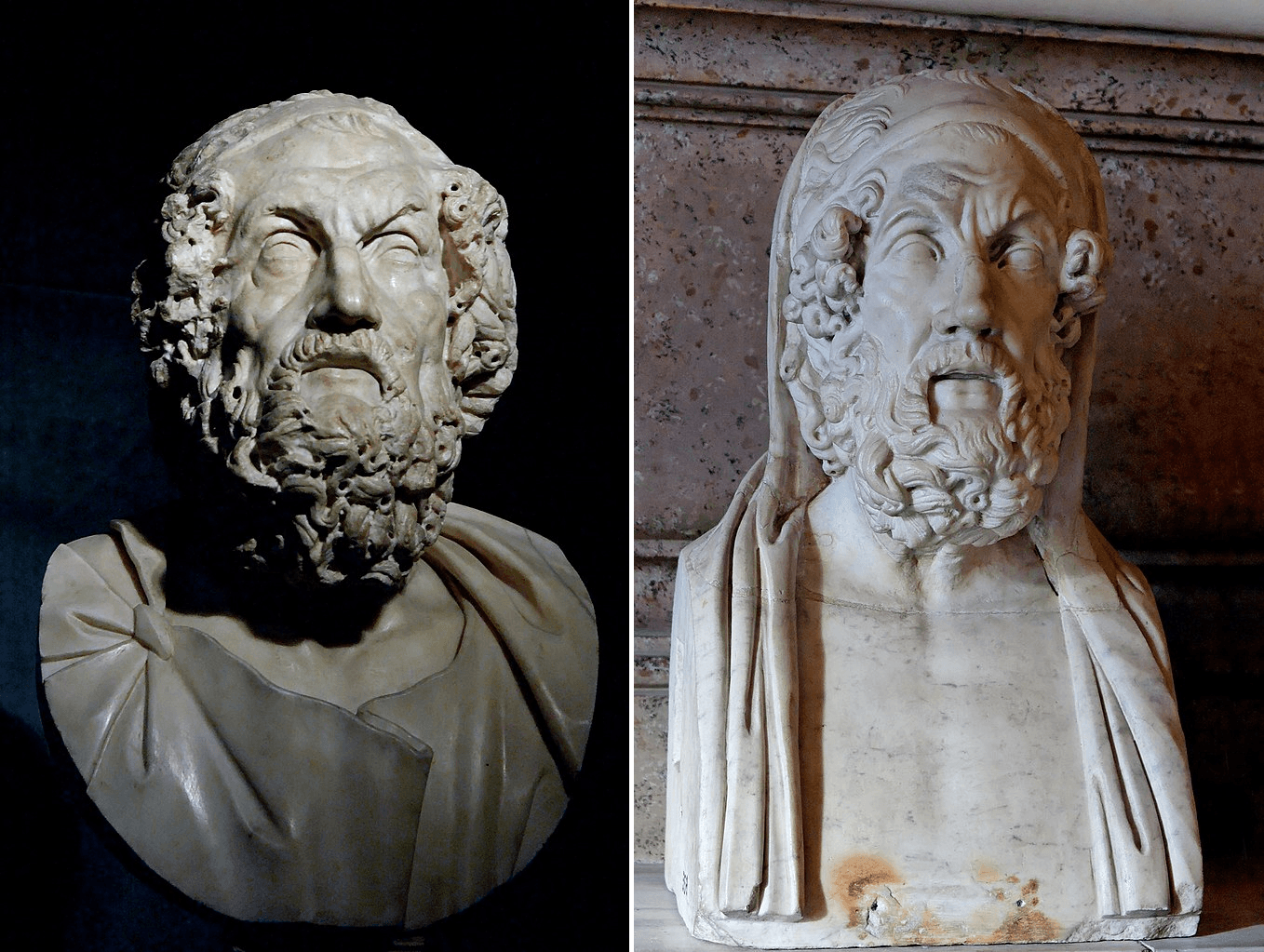 La supuesta ceguera de Homero podría deberse a la identificación con el aedo Demódoco, que recita en cierto pasaje de la Odisea. En el tercero de los Himnos homéricos, que también se le atribuían en la Antigüedad, se menciona a otro bardo ciego de Quíos: «Todos sus cantos —dice— son por siempre los mejores». La clásica estampa de Homero, como se recrea en estas copias romanas de los Museos Capitolinos, es puramente imaginaria. Pincha aquí.